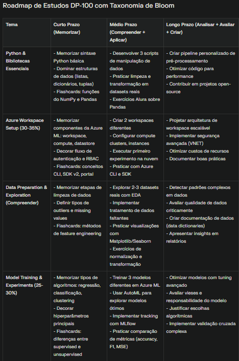 Ficou sensacional o seu roadmap! A aplicação da Taxonomia de Bloom para dividir os níveis de aprendizado (Memorizar, Compreender, Aplicar, etc.) trouxe uma clareza muito grande para a evolução dos seus estudos.
