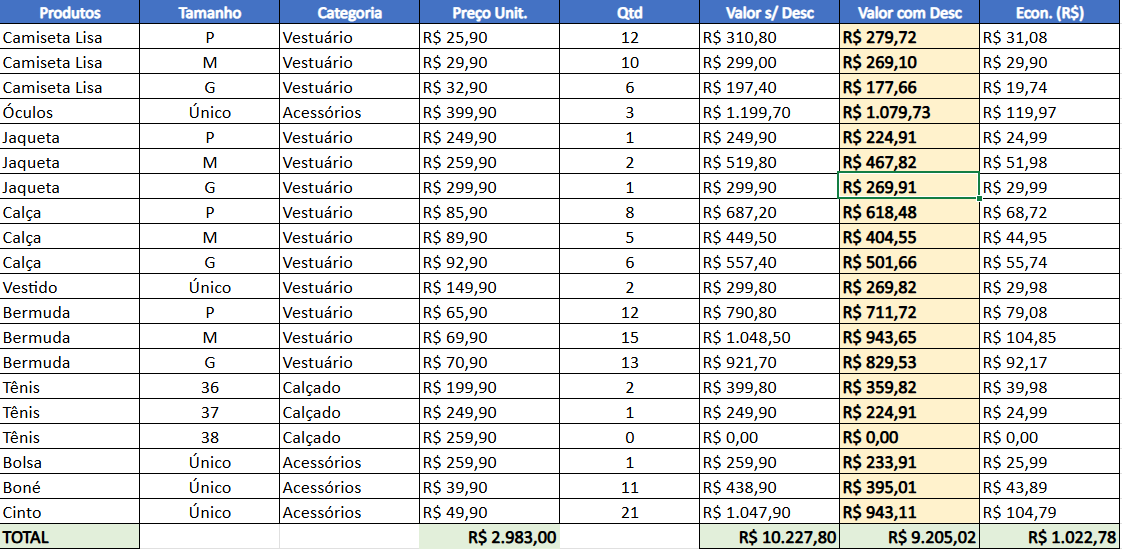 Gostei da sua explicação, a lógica de aplicar 10% de desconto sobre o valor total (Preço Unitário × Quantidade) funciona muito bem e deixa o cálculo direto e organizado. Sua tabela mostra que você estruturou tudo de forma clara.