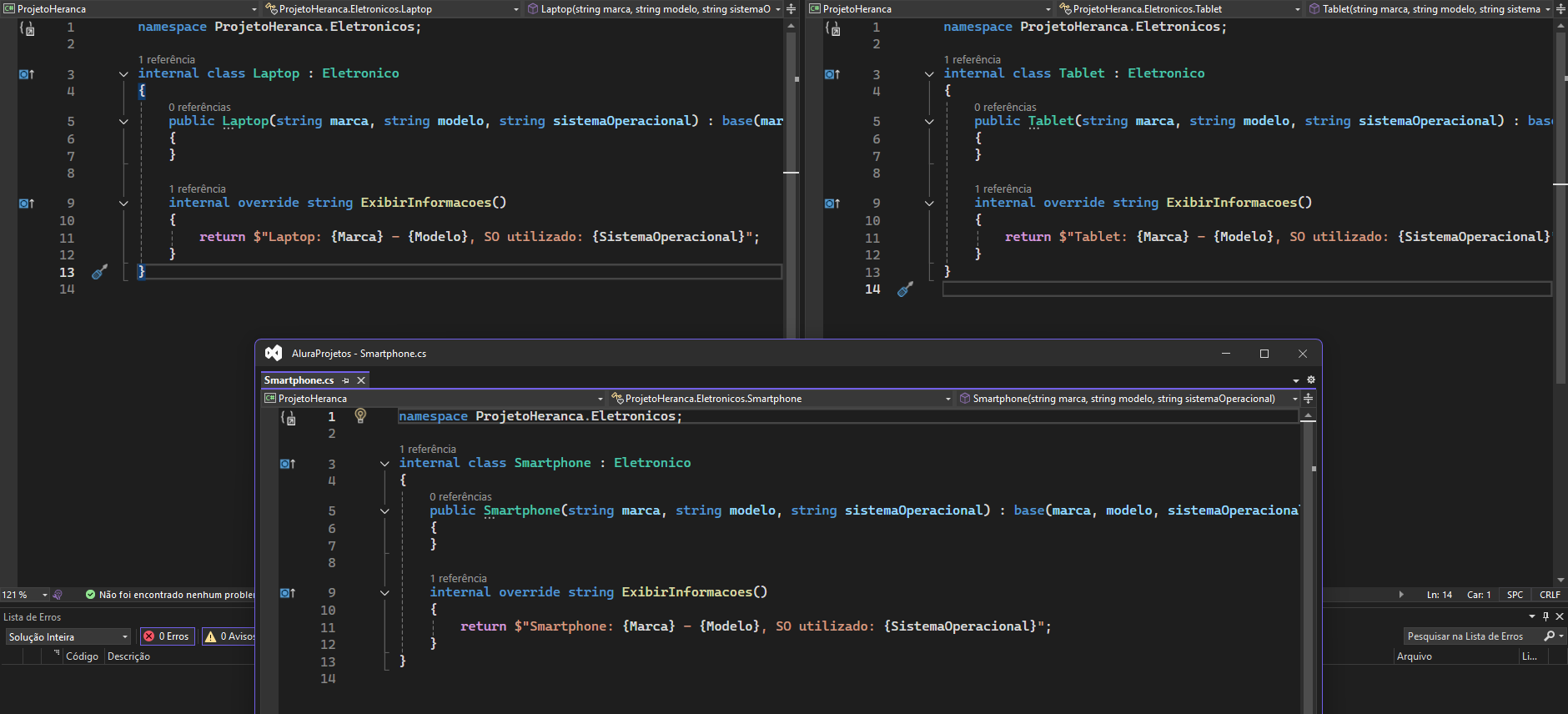 - Criar uma hierarquia de classes representando produtos eletrônicos, como Smartphone, Tablet e Laptop. Utilize herança para implementar um método ExibirInformacoes que retorne informações específicas de cada produto.