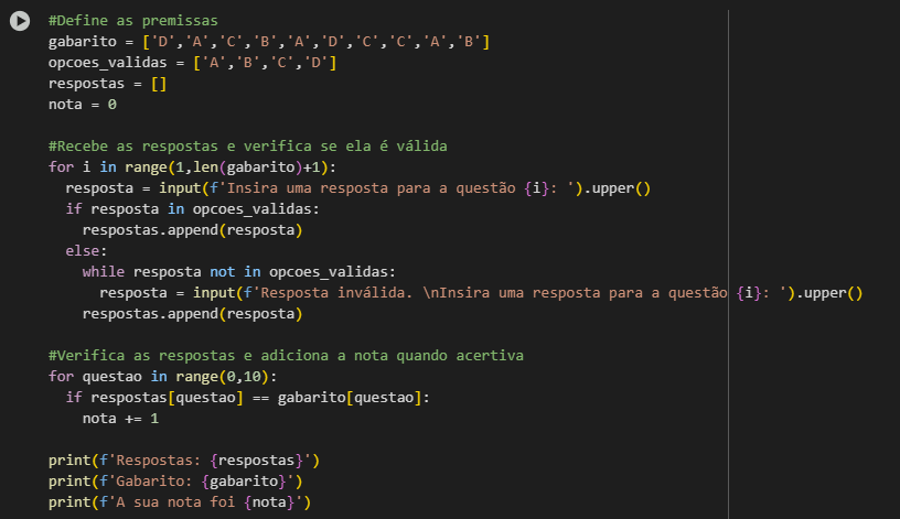 TypeError Traceback (most recent call last) in <cell line: 0>() 20 nota += 1 21 ---> 22 print(f'Respostas: {respostas}') 23 print(f'Gabarito: {gabarito}') 24 print(f'A sua nota foi {nota}')