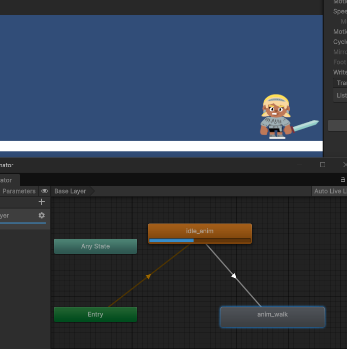 Transições no Animator: No Animator, verifique se a transição entre anim_idle e anim_walk está configurada com a condição correta. A seta de transição deve ter a condição isMoving definida como true para ir de idle para walk, e false para voltar de walk para idle.