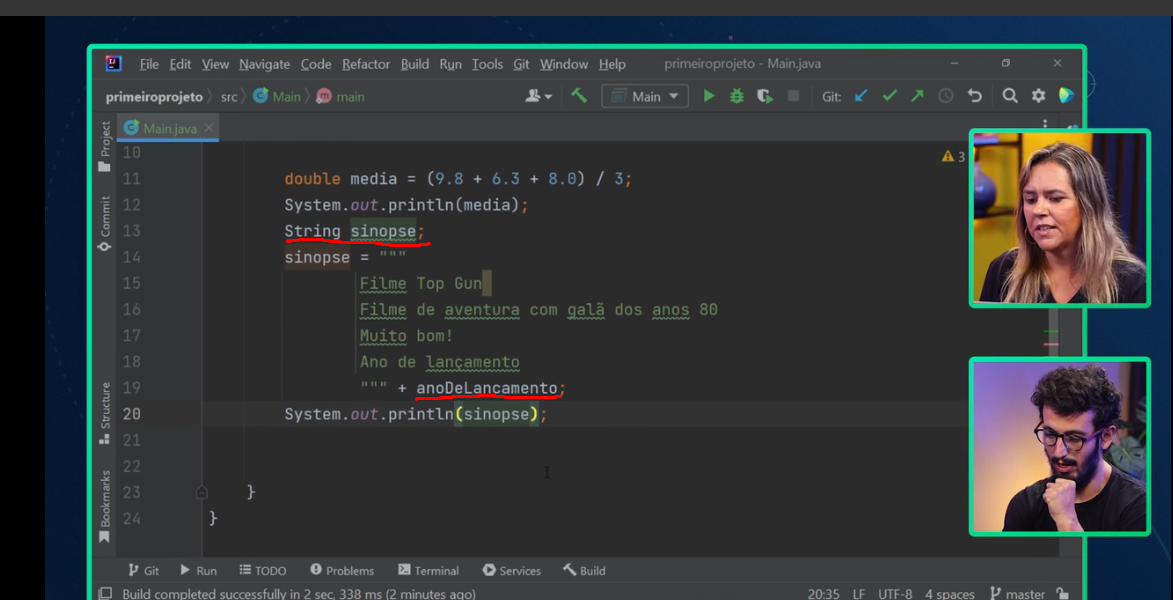 Bem, no código mostrado no vídeo, a variável "anoDeLancamento" é um int, e a variável "sinopse" é uma String, tudo certo até então