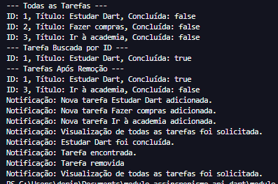Quando você usa uma Stream com um listener, as notificações são processadas assim que o método que chama streamController.add é executado. No entanto, na prática, o terminal pode agrupar ou ordenar as mensagens dependendo da ordem em que o código produz as saídas. Se todas as notificações apareceram apenas no final, é provável que o código que imprime as tarefas esteja sendo executado antes que o listener tenha tempo de exibir cada mensagem no console.