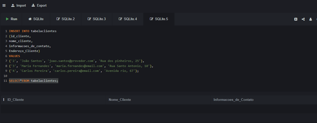 Depois, execute o INSERT e o SELECT, respectivamente:
