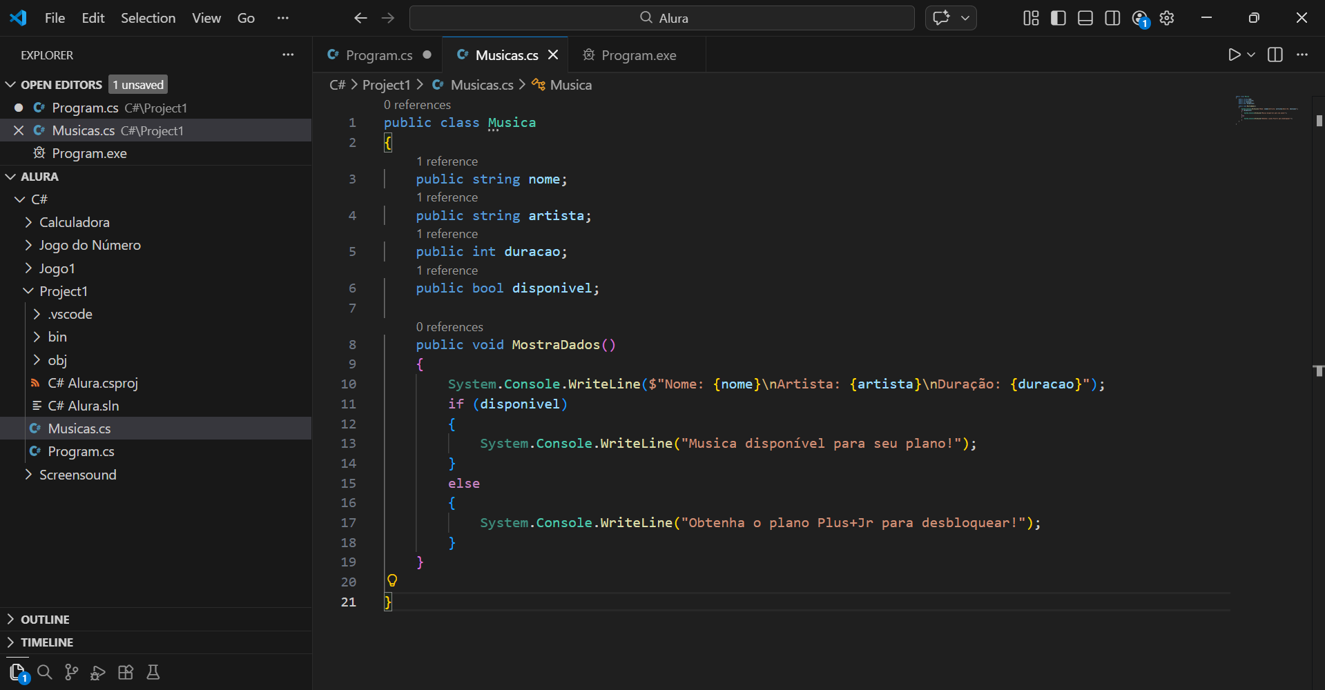 Estou tentando criar uma nova classe no Curso C#: Aplicando a orienteação a objeto, mas estou com problemas recorrentes e nescessito de ajuda para continuar no curso. A classe que eu tento criar não funciona do jeito apresentado no curso. Eu tento criar a classe em um arquivo de código adicional Uma Classe sendo criada sem problemas. , mas ao usa-lá no projeto principal, ela mostra um erro de build