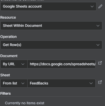 Ao tentar localizar a planilha (do exercício da FlexData), só consigo "forçar" encontrar a planilha (compartilhada pelo e-mail do agente da api da google sheets) inserindo diretamente o link do arquivo. Enquanto, segundo o material da aula relacionada, supostamente era pra estar já disponível buscando por "file" mesmo (refiz o perfil, credencial, o proprio arquivo do sheets, e também não importa quanto tempo eu espere, nunca aparece no campo "Documents"