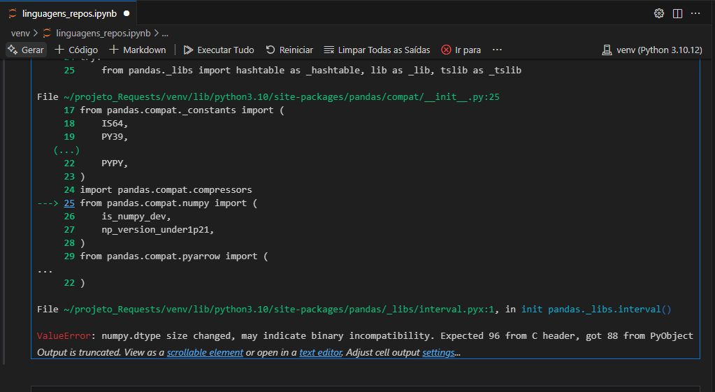 O erro é sobre incompatibilidade de versões entre pandas e numpy. Uma sugestão para resolver isso é reinstalar o numpy e pandas juntos, para que sejam compilados com versões atuais.