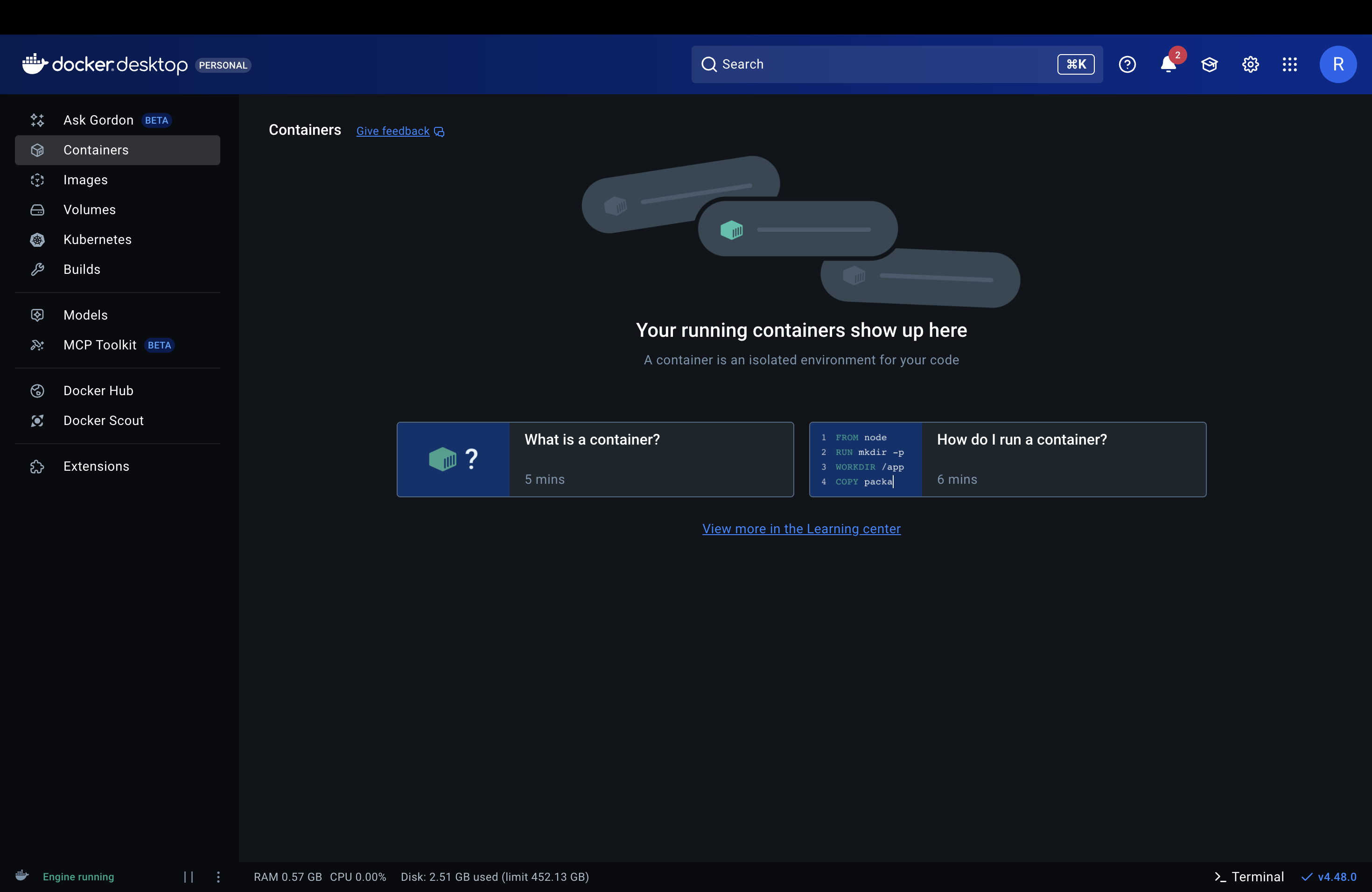 - Após a instalação, certifique-se de que o Docker Desktop está em execução. Você deve ver o ícone da baleia na barra de menus do macOS.