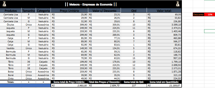 Observei que você explorou as referências absolutas para aplicar corretamente o desconto, utilizou muito bem as fórmulas para calcular o preço final dos produtos e ainda compreendeu a importância da formatação organizada para a clareza das informações na planilha.