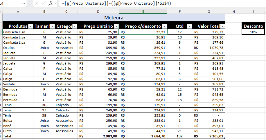 Na planilha com recurso de tabela usei a fórmula =[@[Preço Unitário]]-([@[Preço Unitário]]*$I$4), onde @ significa a linha atual e dentro dos colchetes o campo da base de dados referenciado no cálculo