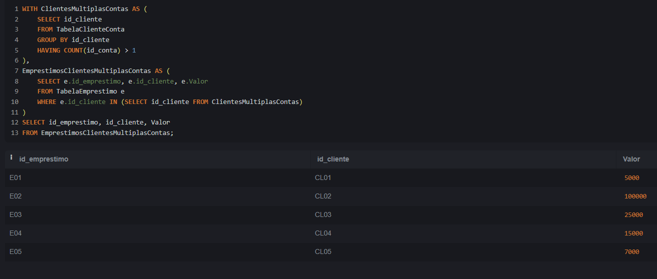 Em seguida, execute novamente a CTE para identificar clientes com múltiplas contas e os empréstimos. O resultado será como mostrado abaixo: